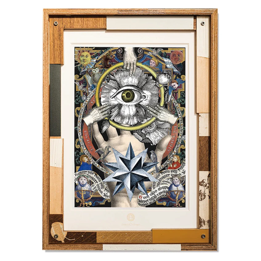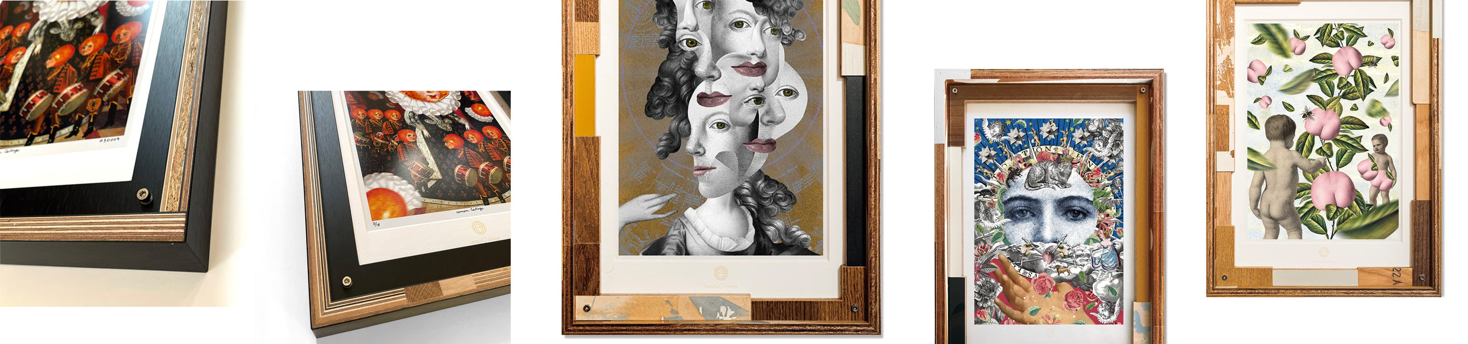 端材をコラージュして製作するこちらのユニーク額は、もはや額そのものがアート、同じデザインものはありません。